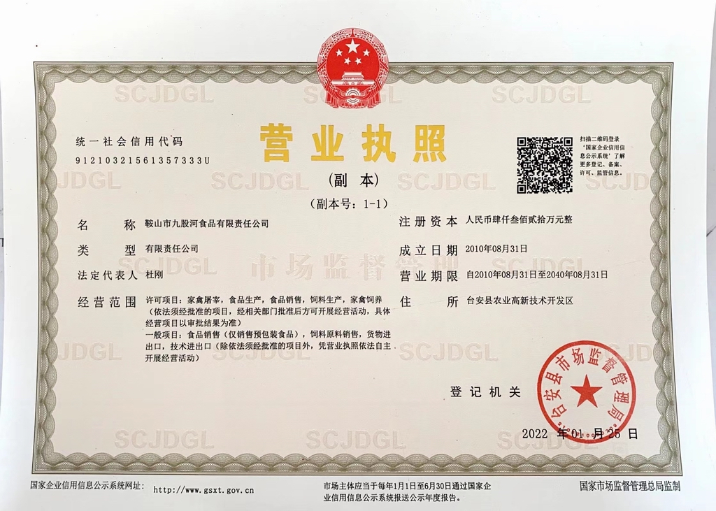 1997年丨九股河誕生于遼寧臺安,成立臺安縣九股河農業發展有限公司2003年丨九股河走進錦州市,在凌海成立凌海九股河食品有限公司2008年丨成立凌海九股河飼料有限公司2010年丨九股河與禾豐合作后,成立鞍山市九股河食品有限責任公司,從此,禾豐九股河走進了高速發展之路2011年丨繼續在遼西闊步,成立葫蘆島九股河食品有限公司同年,臺安縣九股河農業發展有限公司養殖部成立,按下規?;\養小區建設的快進鍵2